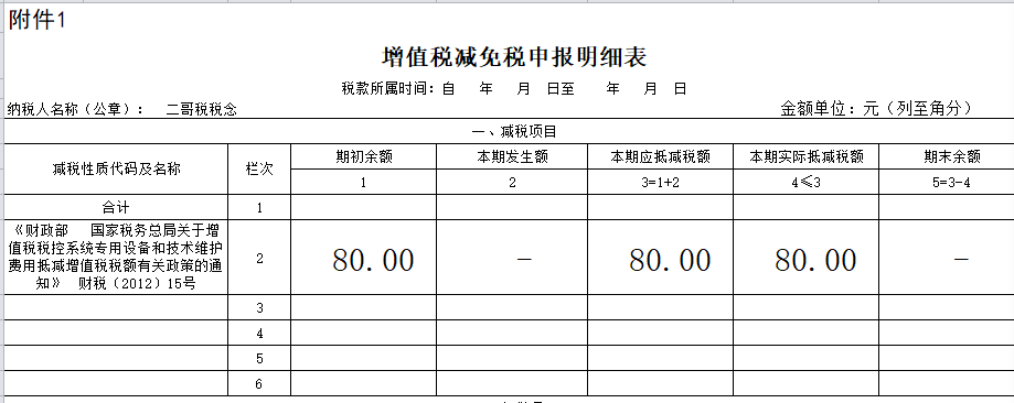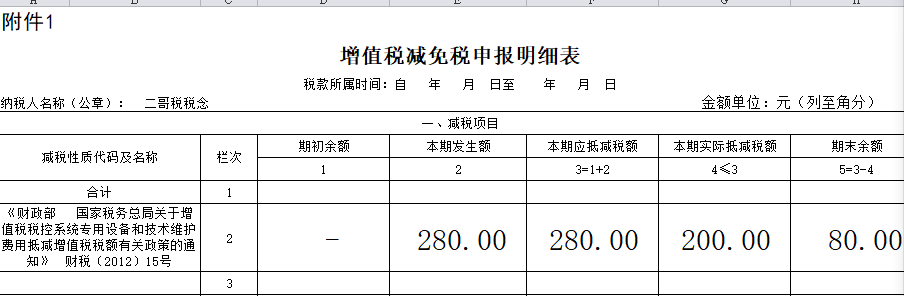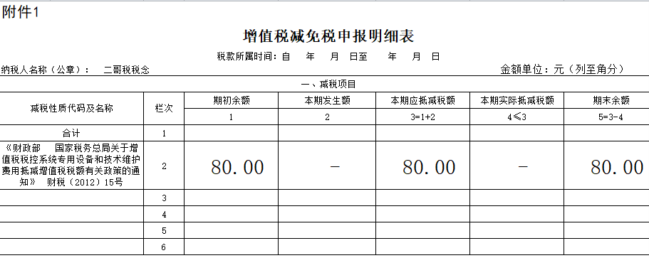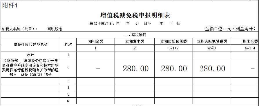 1、《增值税减免税申报明细表》选择减免性质名称:财税[2012]15号 财政部、国家税务总局关于增值税税控系统专用设备和技术维护费用抵减增值税税额有关政策的通知。