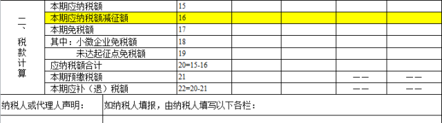 如果下期仍然没有产生应纳税额,则16行不填写数字,减免表期末数据自动到期初,留着以后继续抵。