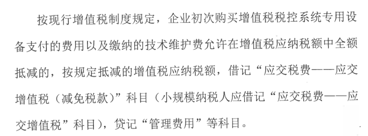 根据《财政部国家税务总局关于增值税税控系统专用设备和技术维护费用抵减增值税税额有关政策的通知》第一条、第二条和第三条的规定,增值税纳税人2011年12月1日(含,下同)以后初次购买增值税税控系统专用设备(包括分开票机)支付的费用,可凭购买增值税税控系统专用设备取得的增值税专用发票,在增值税应纳税额中全额抵减(抵减额为价税合计额),不足抵减的可结转下期继续抵减。增值税纳税人2011年12月1日以后缴纳的技术维护费(不含补缴的2011年11月30日以前的技术维护费),可凭技术维护服务单位开具的技术维护费发票,在增值税应纳税额中全额抵减,不足抵减的可结转下期继续抵减。技术维护费按照价格主管部门核定的标准执行。增值税一般纳税人支付的二项费用在增值税应纳税额中全额抵减的,其增值税专用发票不作为增值税抵扣凭证,其进项税额不得从销项税额中抵扣。