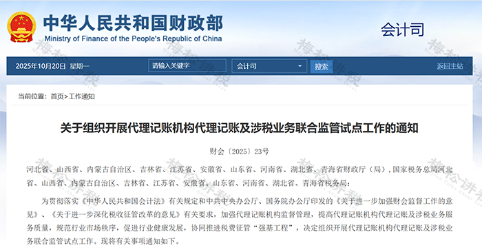 10月17日,财政部 国家税务总局发布《关于组织开展代理记账机构代理记账及涉税业务联合监管试点工作的通知》。
