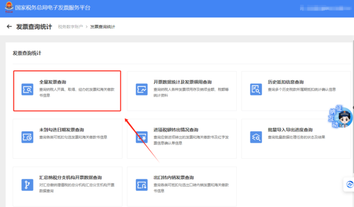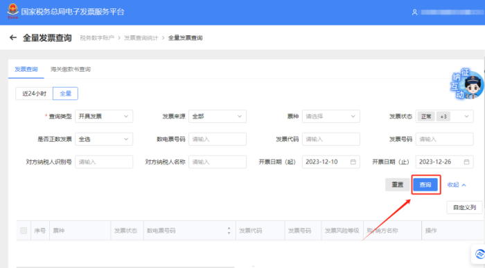 全量发票查询页面,进入相关模块,选择相应的查询条件,点击【查询】,系统会依据条件展示查询结果,在查询结果中选择需要导出的发票数据,点击导出即可。
