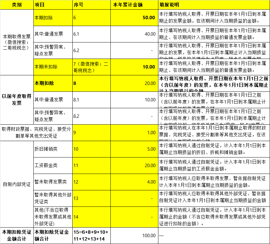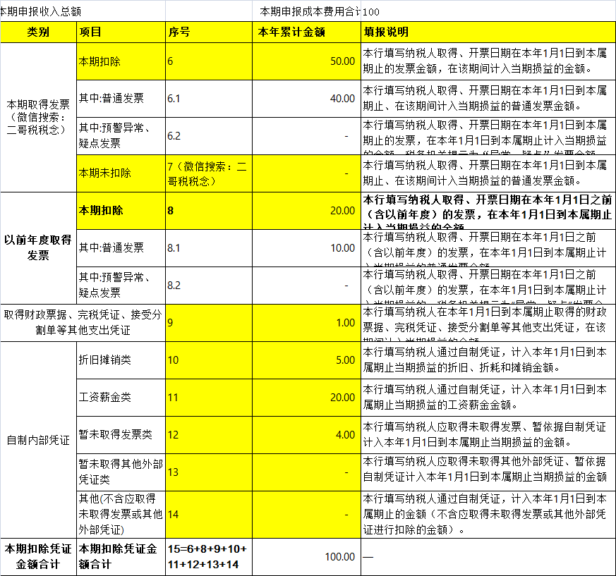 这个表设计逻辑其实很简单,就是让你把你成本费用的构成分类一下,分别告诉税务局,有多少是取得发票,多少没取得,多少是内部凭证。