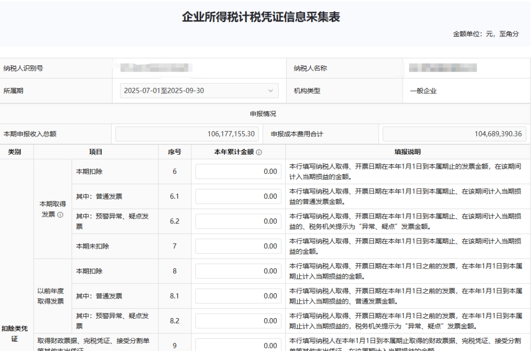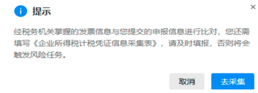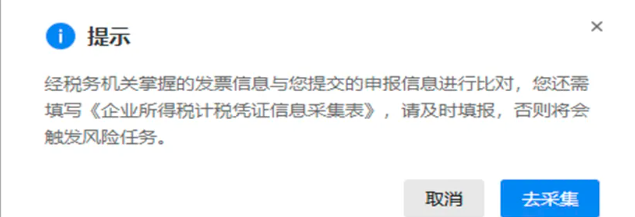 所以,当你填写了职工薪酬,系统取了你发票数,通过数据模型分析出你成本取票偏差超过一定值,系统会提示你填写详细的计税凭证采集表。