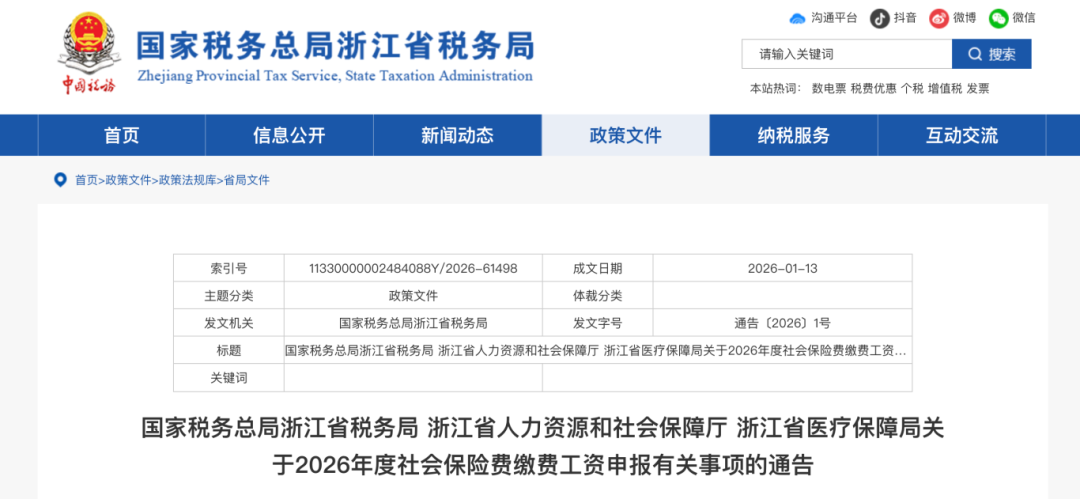 1月22日,浙江省税务局发布《关于2026年度社会保险费缴费工资申报有关事项的通告》。