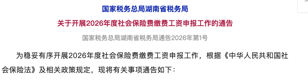 1月29日,湖南省税务局发布《关于开展2026年度社会保险费缴费工资申报有关事项的通告》。