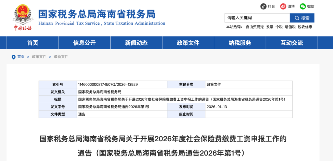 1月13日,海南省税务局发布《关于开展2026年度社会保险费缴费工资申报工作的通告(国家税务总局海南省税务局通告2026年第1号)》。