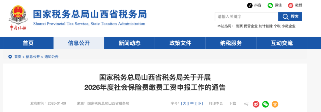 1月9日,山西省税务局发布《关于开展2026年度社会保险费缴费工资申报工作的通告》。