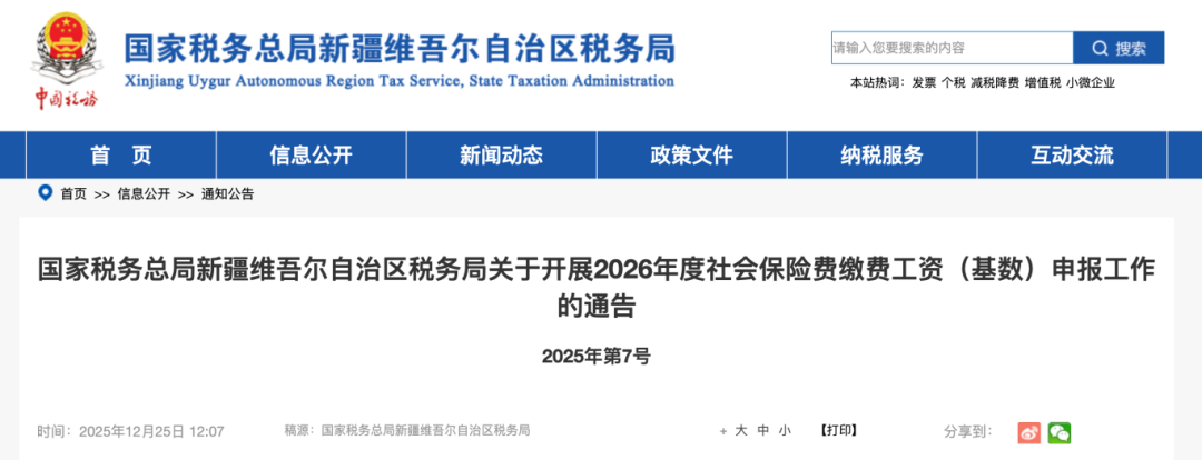 12月25日,新疆维吾尔自治区税务局关于开展2026年度社会保险费缴费工资(基数)申报工作的通告。