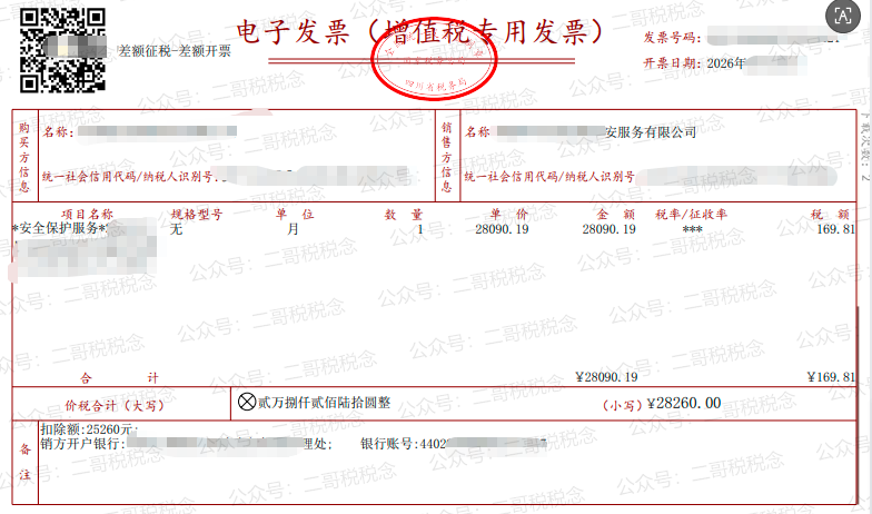 **公司是一家安保公司,2026年公司从A公司取得安保费用28260,其中保安人员的工资计社保等费用25260。公司选择差额征收,无法简易计税了!