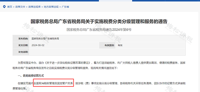 2024年8月2日,国家税务总局广东省税务局发布2024年第6号通告,明确全面取消税收管理员固定管户关系,以涉税事项分类分级、团队协作承接征管任务,成为全国改革标杆。