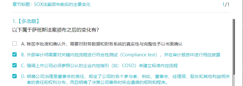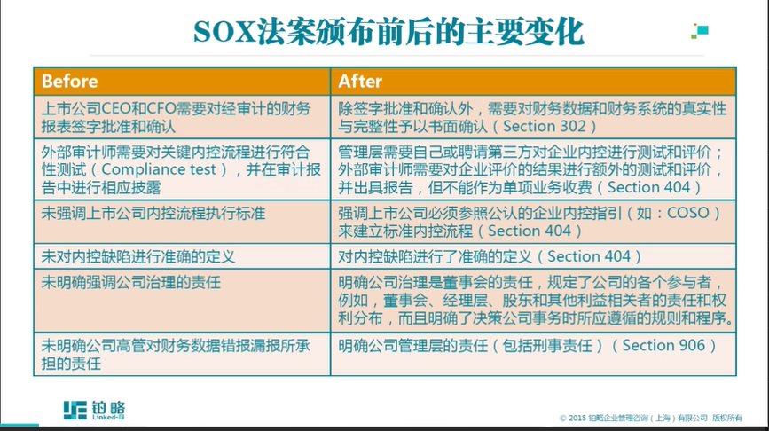 您好,具体请参考课程《萨班斯法案与中国内控规定梳理与比较》中章节《SOX法案颁布前后的主要变化》相关内容。
