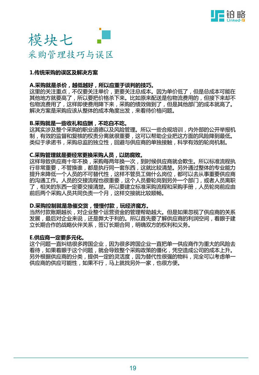 本报告讲解:梳理采购管理的流程及控制点;介绍供应商分类以及非原材料采购的项目控制;回顾采购管理的误区,采购人员KPI设定,以及采购人员能力的要求等;真实案例分析。