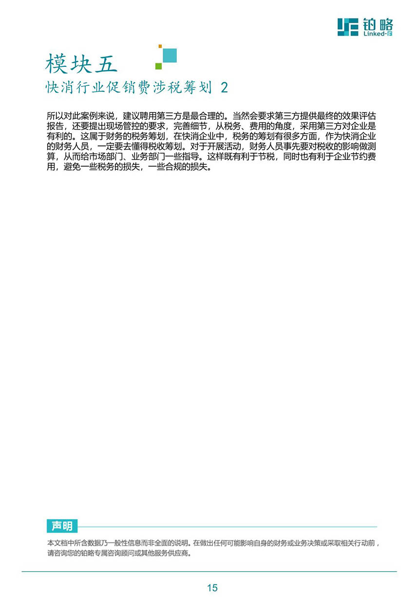 本报告讲解:快消行业营销费用预算管理(快消行业营销费用预算编制的基本方法;快消行业营销费用财务核销时审核重点;快消行业营销费用预算编制的原则;快消行业营销费用预算执行的控制);快消行业促销费涉税筹划。