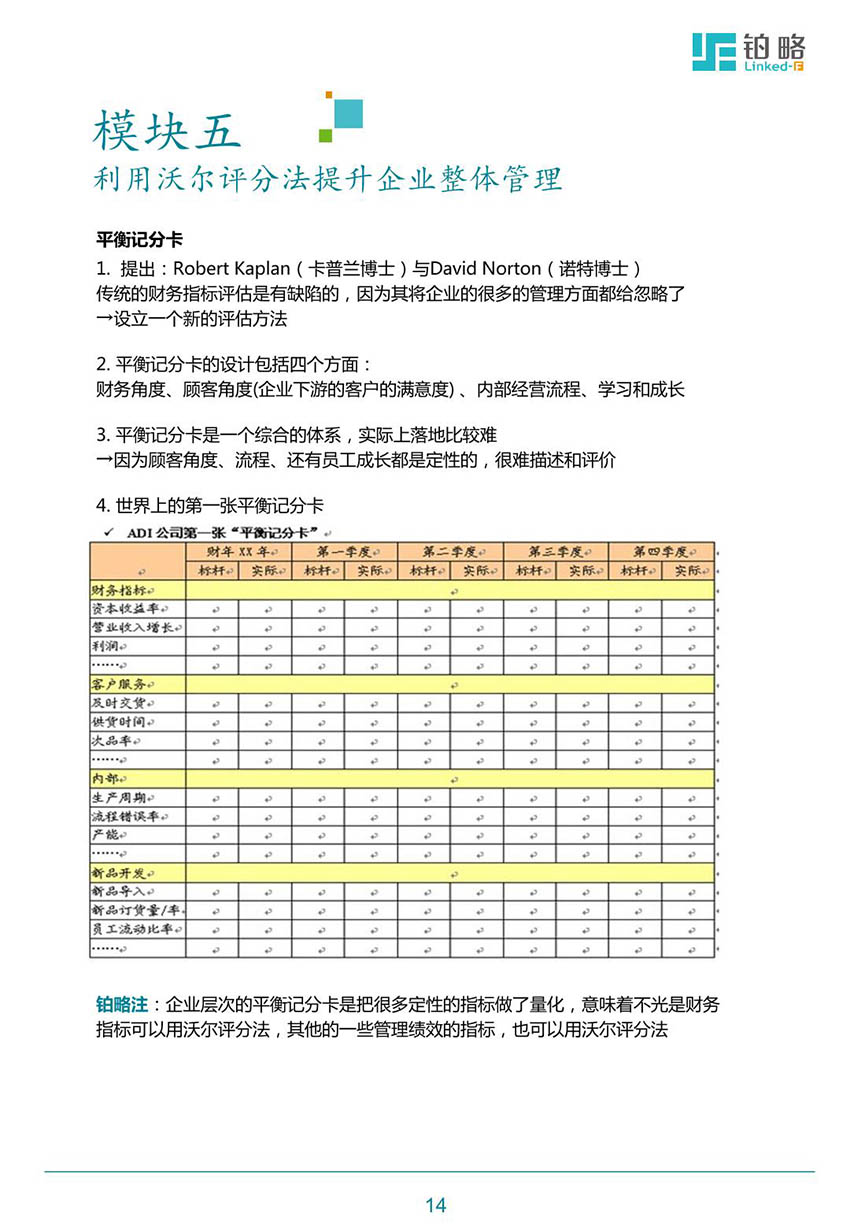 本课程讲解:关于沃尔评分法的简要介绍;沃尔评分法的优化的方法;沃尔评分法在财务绩效评估中的应用;如何利用沃尔评分法如何提升企业的整体管理。